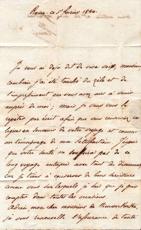 Lettera autografa firmata, datata ‘Rome ce 5 fevrier 1848’ e indirizzata a Emilien de Nieuwerkerke; scritta per diciassette righe più la firma, sulle prime due facciate di un piccolo bifolio. ‘(…) Je vous ai déja dit de vive voix, monsieur, combien j’ai été touché du zèle et de l’empressement que vous avez mis à venir auprès de moi; mais je veux vous le repéter par écrit afin que vous conserviez ces lignes en souvenir de votre voyage et comme un témoignage de ma satisfaition. J’espère que votre santé ne souffrira pas de ce long voyage entrepris avec tout de dévouement, car je tiens à conserver de bons serviteurs comme vous sur lesquels je sais que je puis compter dans toutes les occasions (…)’. Émile Félix FLEURY (Parigi, 23 dicembre 1815 – 11 dicembre 1884) è stato un generale, politico e diplomatico francese, assai vicino a Napoleone III.