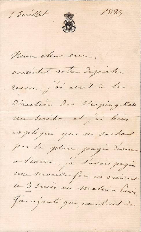 Bifolio scritto per trentadue righe più la firma, datato ‘1 Juillet 1885’. Si parla ad un ignoto ‘cher ami’ di una transazione economica, e del tempo.